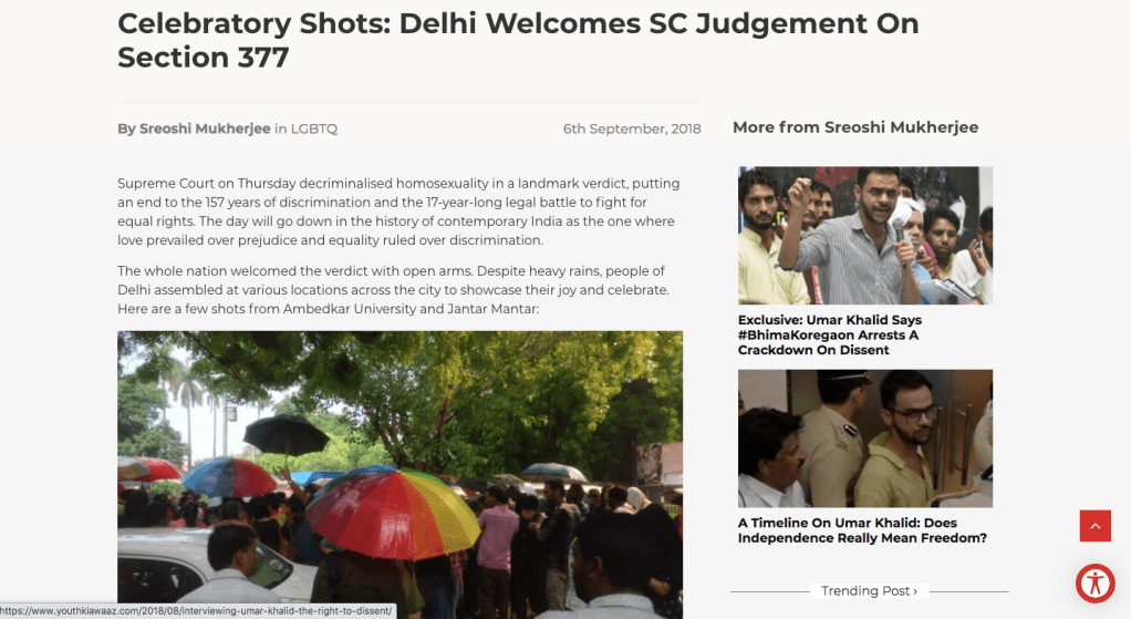Youth Ki Awaaz Posted bysreoo_emJuly 5, 2021July 7, 2021Posted inFrom the Desk This article is of an interview I did with Umar Khalid, an activist and a former student of Delhi’s Jawaharlal Nehru University Photographs at Jantar Mantar, after the Supreme Court of India decriminalised homosexuality in a landmark verdict https://www.youthkiawaaz.com/author/sreoshi_mukherjee/ Like Loading... Related